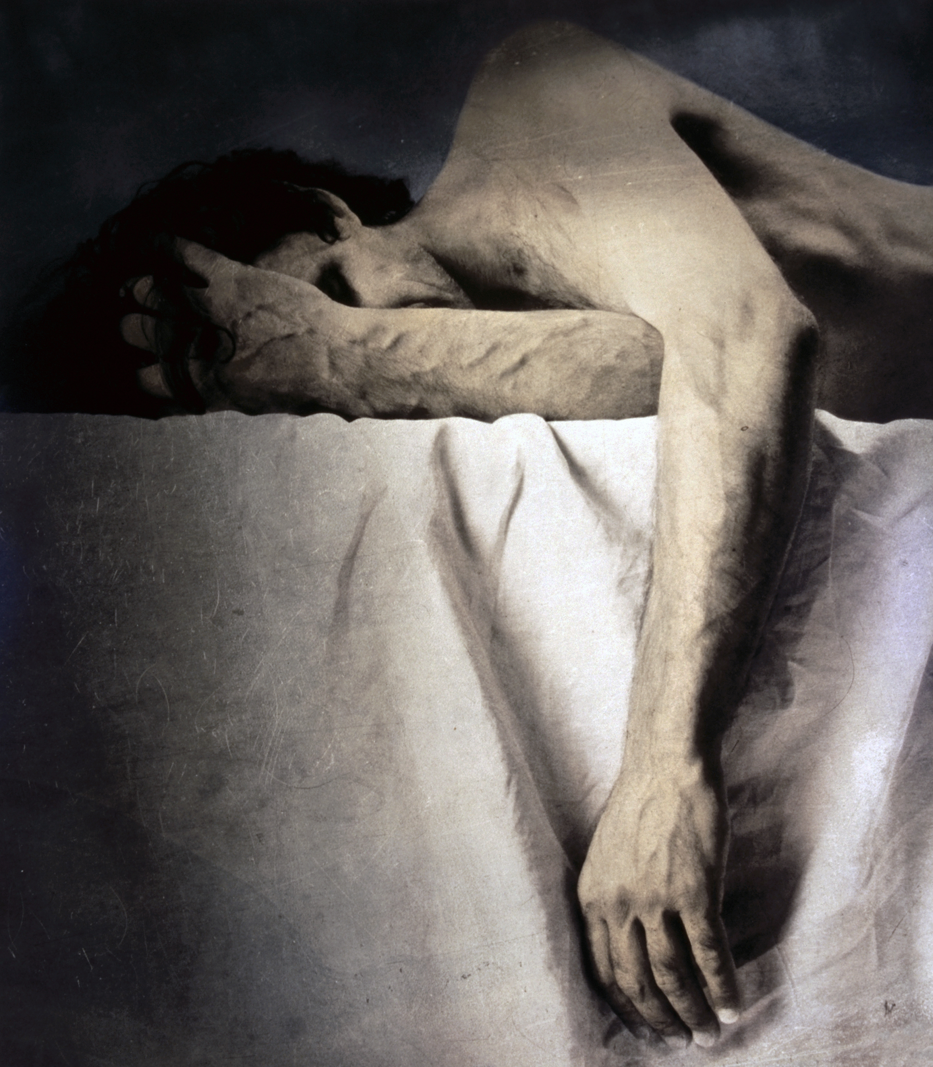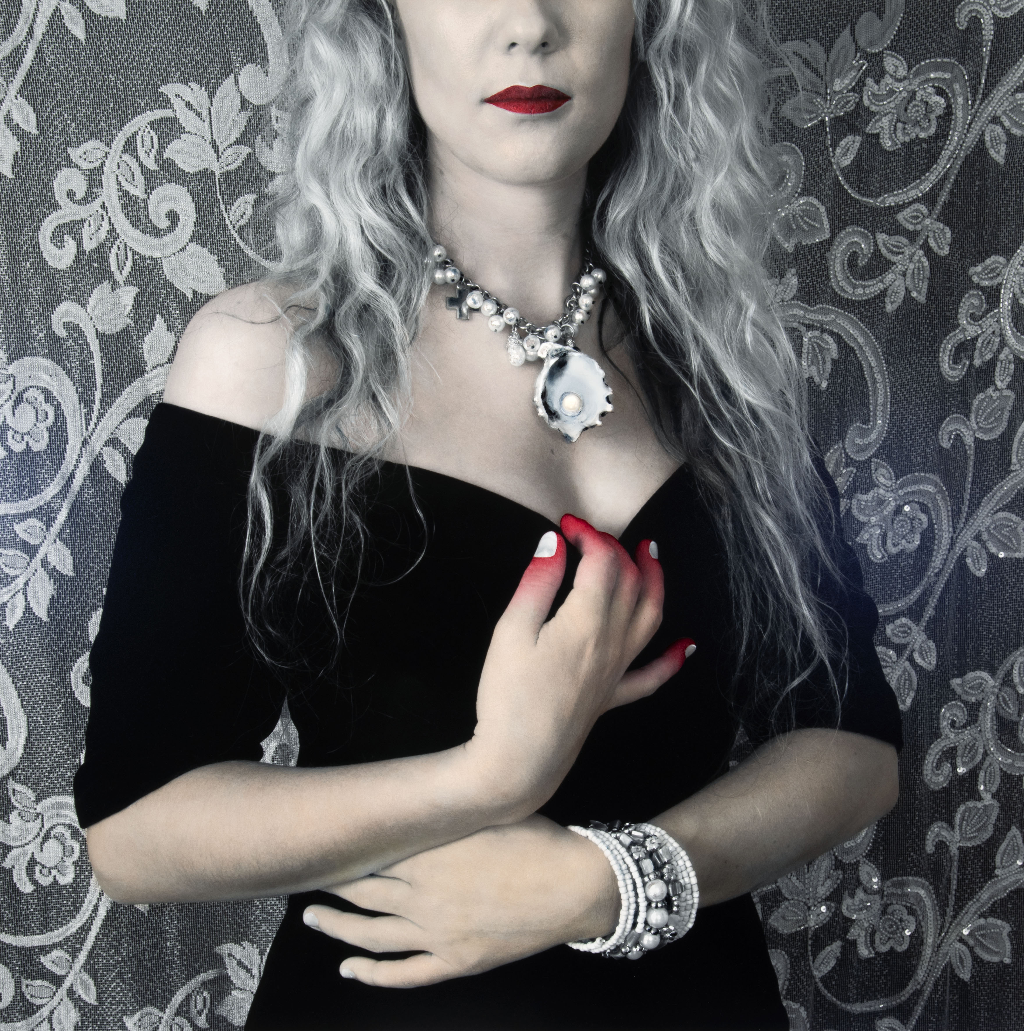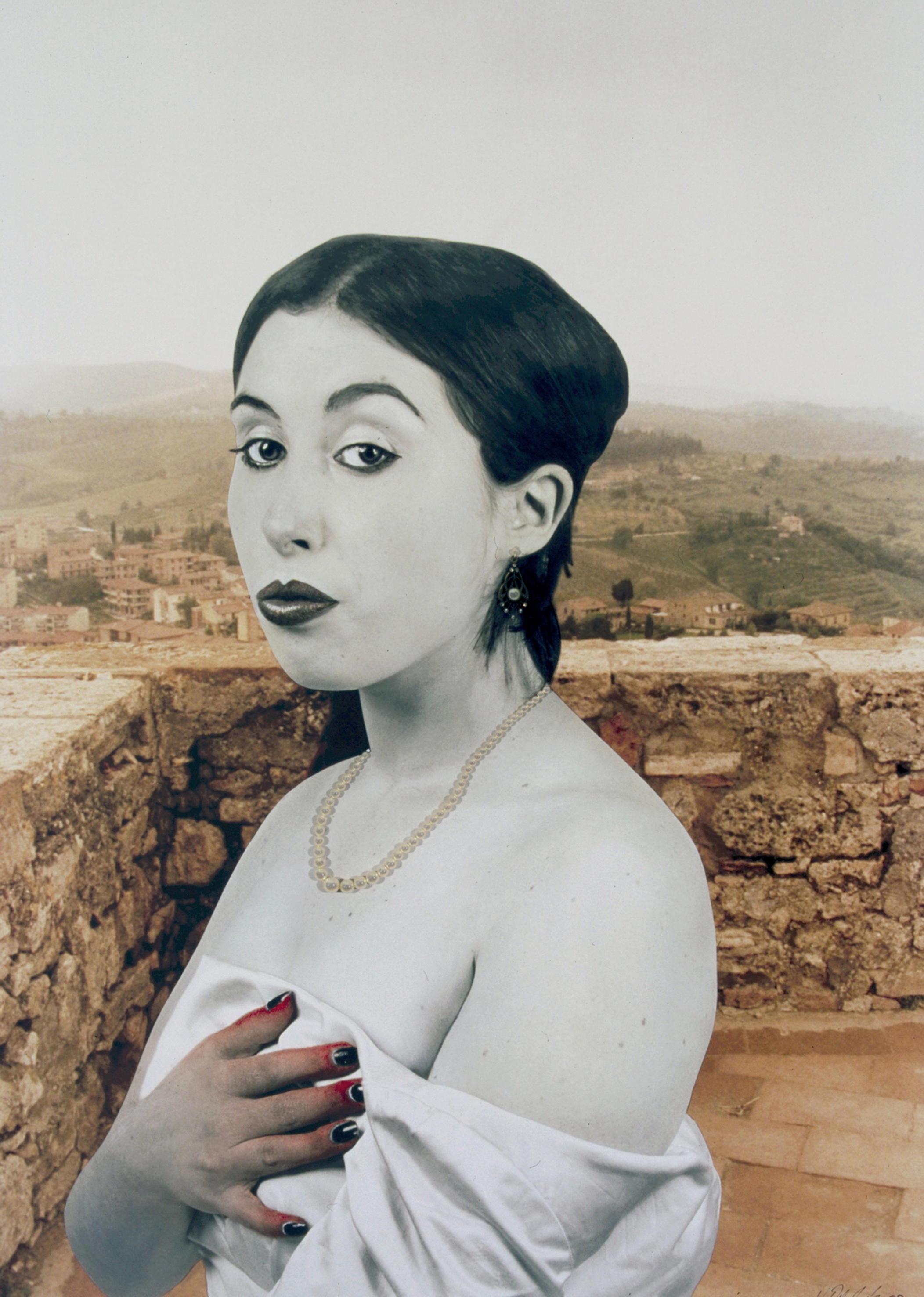 “hand-painting black and white photographs, repositioning them against evocatively muted, colourized backgrounds, and then rephotographing these constructs to create a seamless new image. When in a further optical play, the artist chooses to stitch a string of pearls, an earring or a feathered choker to her finished compositions, her ethereal portraits develop a subtle pulse, seeming to shimmer in and out of three-dimensional perception. In these photographs our tactile awareness is aroused, adding physical sensation to the experience of looking.”