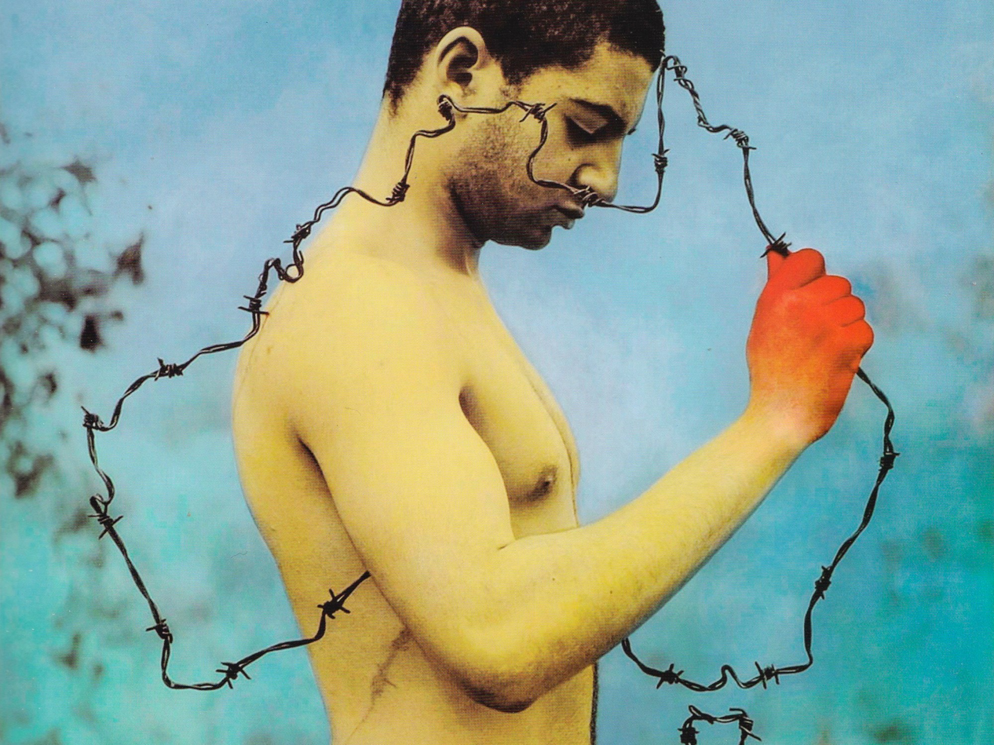 “The recurring image of the red hand [is] emblematic of sacrificial blood…the viewer experiences movement between the perception of sensuous closeness and symbolic distance. In Australia Fair, we experience proximity to the flesh of the young male model, fixating on the red stained hand, and the shadow of the barbed wire across his skin, while on the other we are caught in the powerful semiotics of the barbed wire itself.”