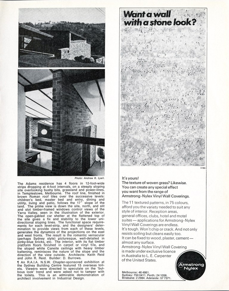 Some of his work was for architects, and what little of that remains is preserved in copies of CROSS-SECTION: A Private Communication to Architects and Master Builders a newsletter printed with good quality illustrations by the Department of Architecture at the University of Melbourne from November 1952 until February-March 1971.