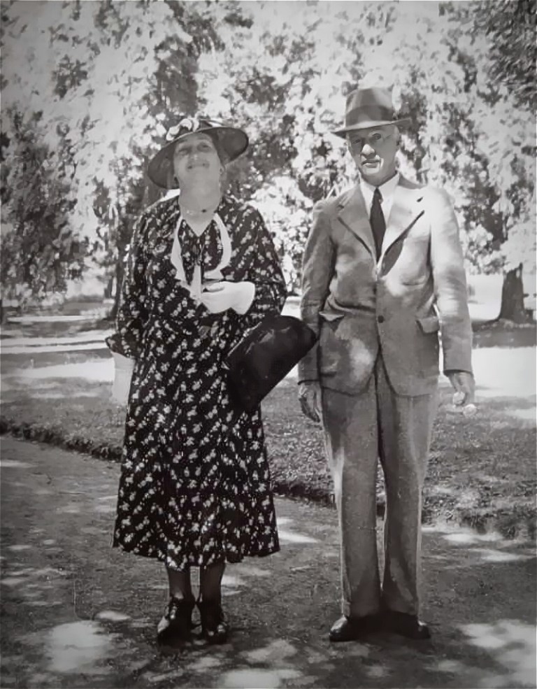 Andrew Robertson Lyell was born 25 October 1913, the only son of Mary Emma Lyell (1876-1950) standing proudly in the snapshot below. She was notable as the second woman to be president of the Historical Society of Victoria 1935-42. Born at Maryborough, Victoria, she became qualified as an accountant before the Institute of Accountants and Auditors rejected the admission of women in 1912 (a rule they reversed in World War One when the shortage of male accountants meant women had to step in to take their places).