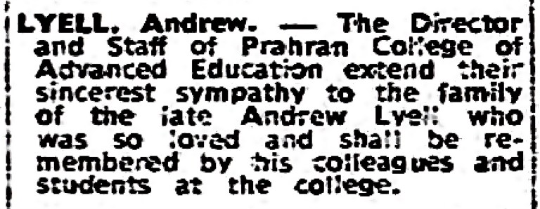 Andrew R. Lyell’s photographs appear amongst the Melbourne Architecture Faculty holdings of 75 black-and-white prints of flats and apartments in Australia of the 1950s-1960s alongside those by Helmut Newton, Wolfgang Sievers, Max Dupain, Mark Strizic David Moore and Ian B. McKenzie. That raises the question of whether it was McKenzie who hired Lyell for the position of technician, having perhaps worked with him on such jobs, however Ian Macrae, who started amongst the first cohort taking the Diploma in photography, does not remember him, and Lyell appears in neither John Cato’s history of the department nor in Judith Buckrich’s Design for Living: A story of ‘Prahran Tech’. No student seems to have photographed him. He has indeed been unfortunately overlooked in histories.