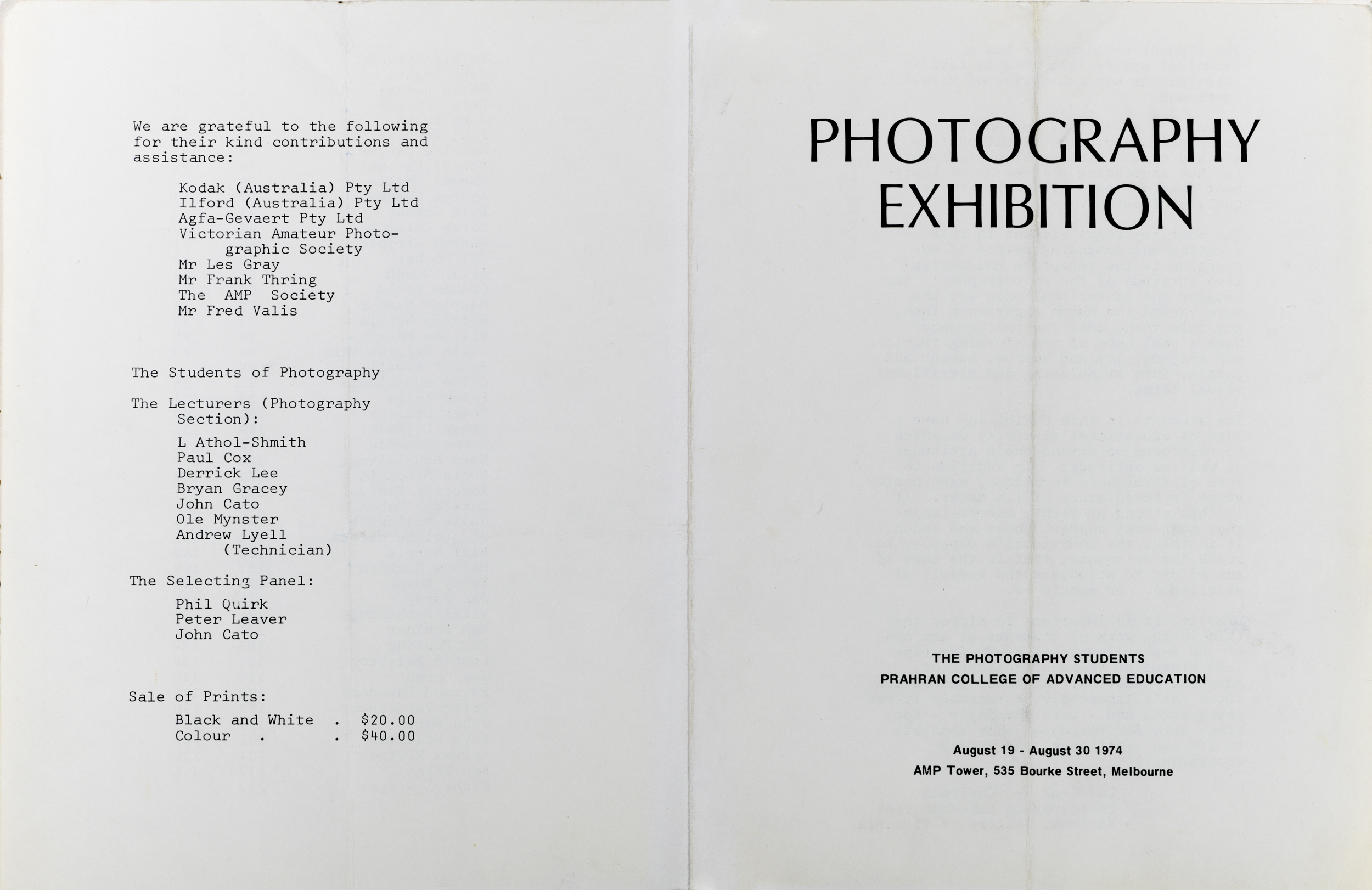 Lyell was sixty-one years old in 1974 when I encountered him, and on the verge of retirement, which then was 65. He was installed in a narrow darkroom/office next to Bedric (‘Fred’) Valis’ printmaking studio, and across the corridor from the photography classroom A4 in which our assessments were held. He is given credit as technician in this catalogue for an exhibition at the AMP Building of Prahran photography students from all years;