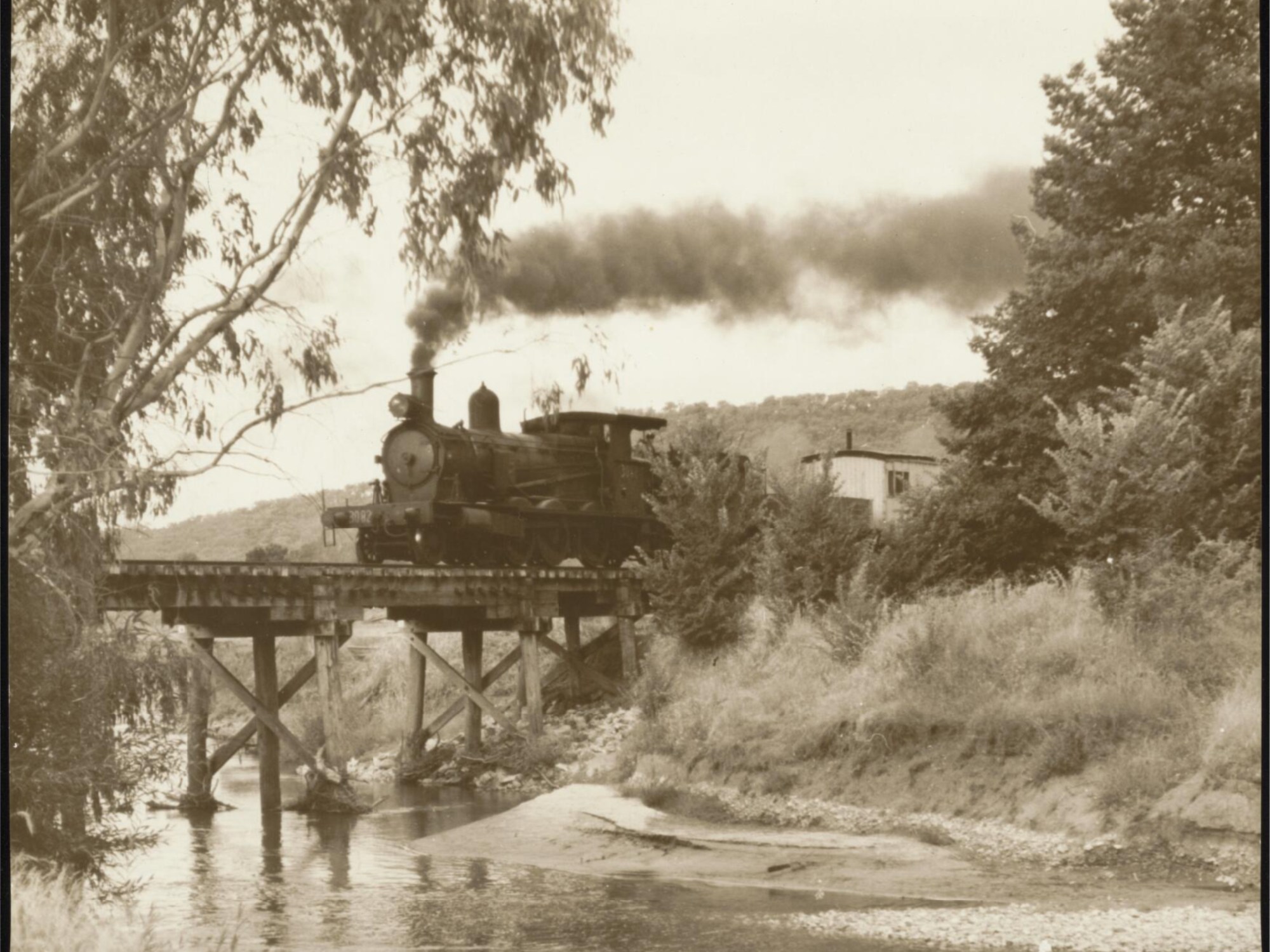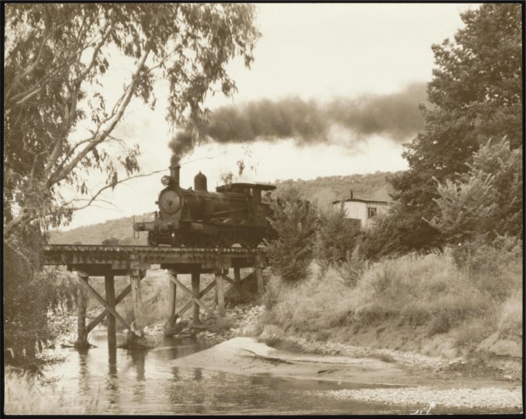 His pictures, about 5,000 of which may be found in the Buckland collection of 25,000 railway transport photographs in the National Library of Australia, while an invaluable, technically excellent archive of the days when steam was the primary means of moving freight and passengers around this country, they may not equate to the virtuoso night performances of the American O. Winston Link, nor do they sweep us up in such energy as is found in the Swiss, René Groebli’s classic book Magie der Schiene (‘The Magic of Steam’). They are picturesque, in that they ‘make a picture’ of the subject in imitation of a picture already seen and admired, and are thus a species of Pictorialism unrelated to the Modernist machine-worship we see in the commercial work of Max Dupain. His image of the Ghan’s then contemporary and thus less glamorous diesel engine is made at a more objective distance but evokes, with the nicely placed framing of a Eucalyptus papuana, the outback landscapes of the classic Australian Pictorialist Harold Cazneaux.