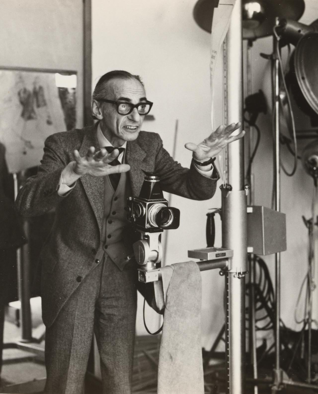 But it was not all just lighting. Athol was a genius at directing models. Urbane, sophisticated and witty, he was by no means handsome, but always impeccably dressed, even when lecturing, in brass-buttoned navy-blue reefer jacket, red waistcoat and Windsor knotted tie—always—while the male students sitting around him (and a couple of his fellow lecturers too) wore flared jeans, beards, long hair and sandals or bare feet. But his mesmerising pop eyes, conspicuous nose and gangly limbs he put to good use. Verbal directions would only interrupt the stream of banter that he used to calm nervous sitters, so after saying perhaps, “Head to the light, now eyes to camera” as if directing a movie star on set, he instead used mime and subtle hand signals; the subject would barely be conscious that they had lifted their chin, shifted their weight, or relaxed their shoulders just the way he wanted them to, they just did it, prompted by his own gestures that they then imitated.
