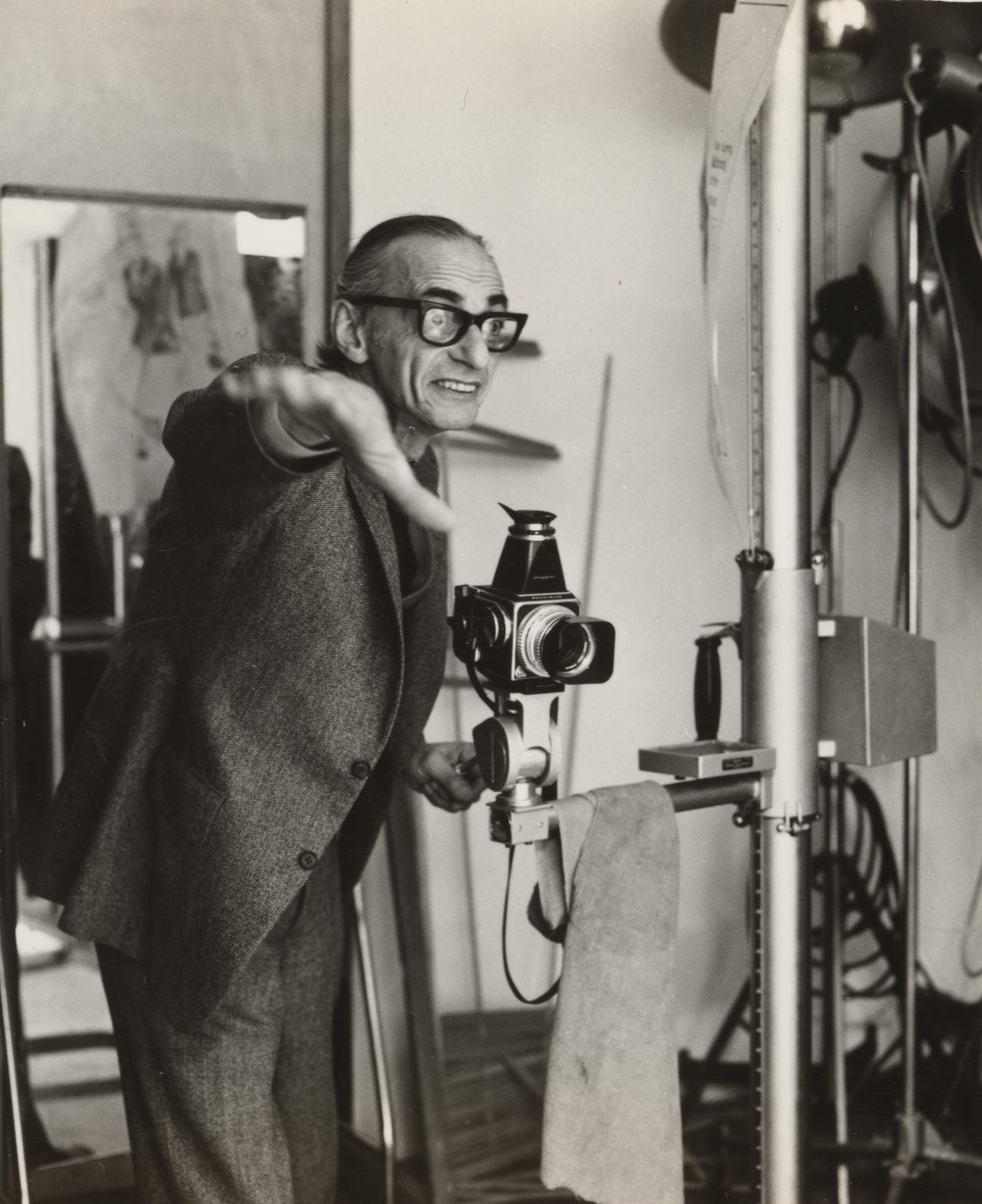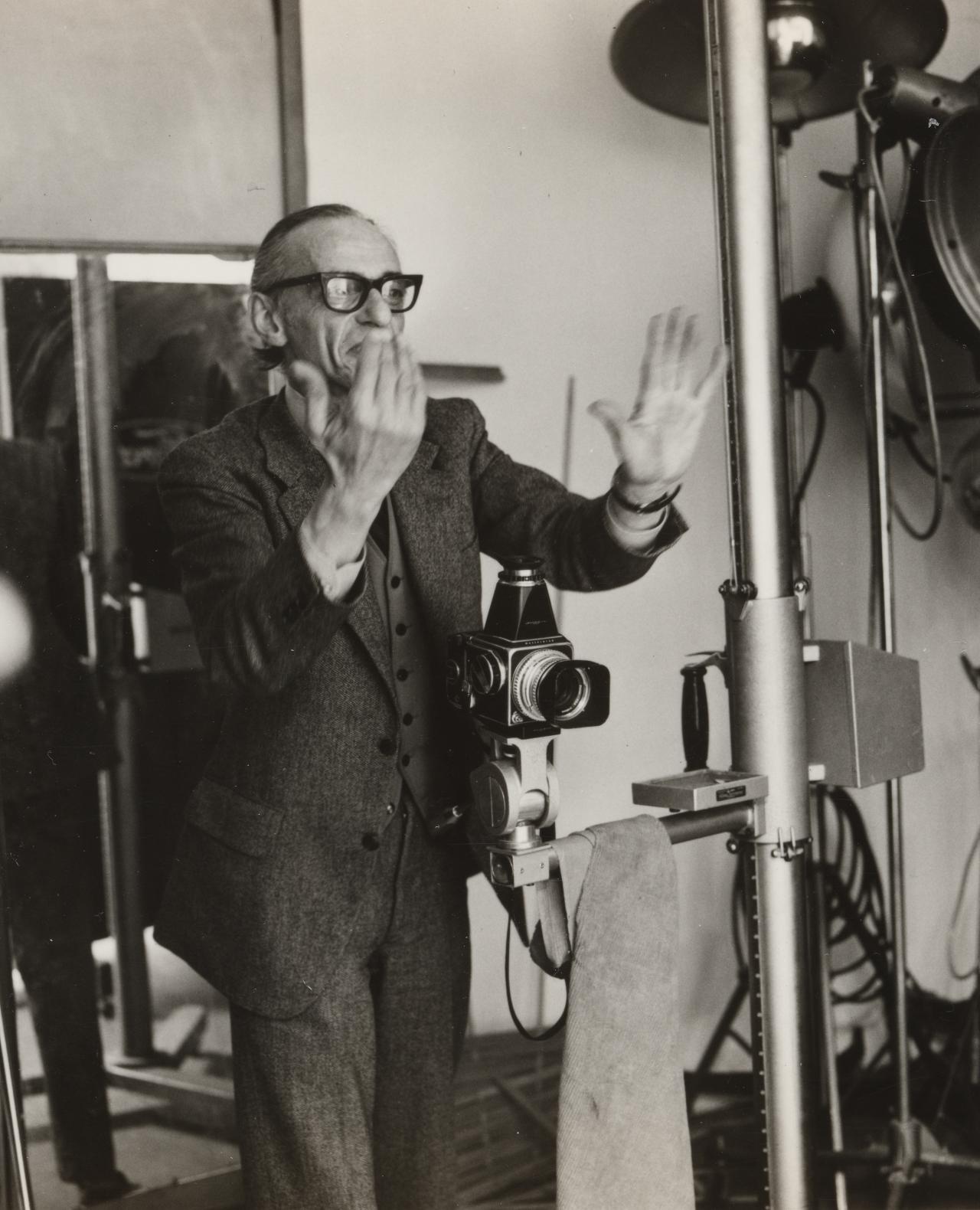 But it was not all just lighting. Athol was a genius at directing models. Urbane, sophisticated and witty, he was by no means handsome, but always impeccably dressed, even when lecturing, in brass-buttoned navy-blue reefer jacket, red waistcoat and Windsor knotted tie—always—while the male students sitting around him (and a couple of his fellow lecturers too) wore flared jeans, beards, long hair and sandals or bare feet. But his mesmerising pop eyes, conspicuous nose and gangly limbs he put to good use. Verbal directions would only interrupt the stream of banter that he used to calm nervous sitters, so after saying perhaps, “Head to the light, now eyes to camera” as if directing a movie star on set, he instead used mime and subtle hand signals; the subject would barely be conscious that they had lifted their chin, shifted their weight, or relaxed their shoulders just the way he wanted them to, they just did it, prompted by his own gestures that they then imitated.
