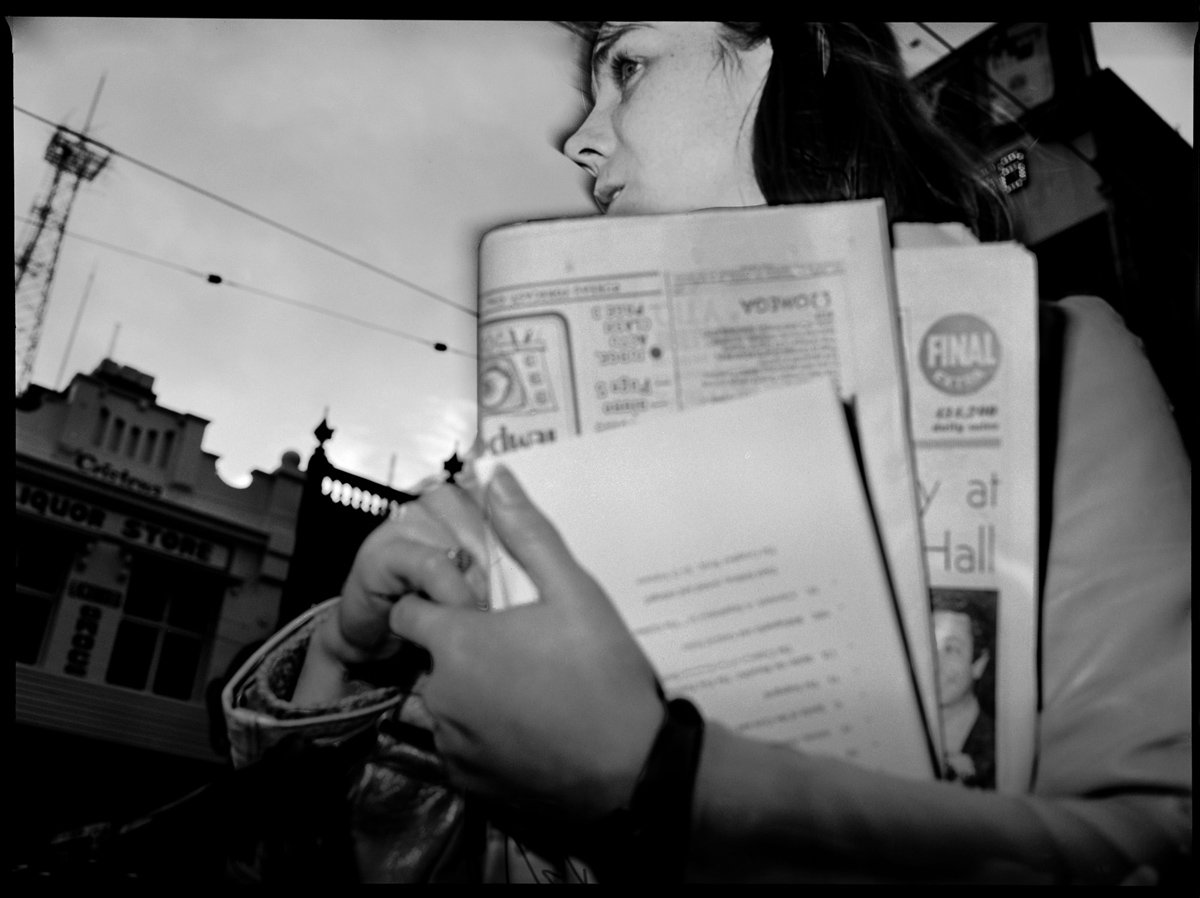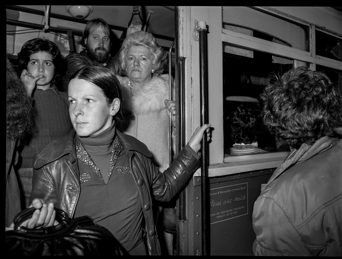 At this especially busy stop opposite Flinders Street station, the background is sometimes visible in the grey, overcast light—early autumn, judging by peoples’ clothes—so that we can read ‘5:06’ on the digital clock, and cigarette and Coke advertisements on the side of the Nicholas Building, because the shutter speed Gale has set is slow enough to pick up the ambient light.