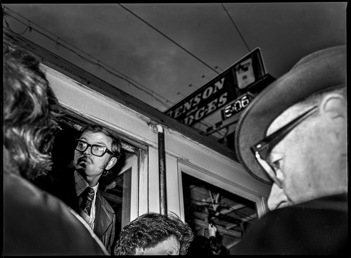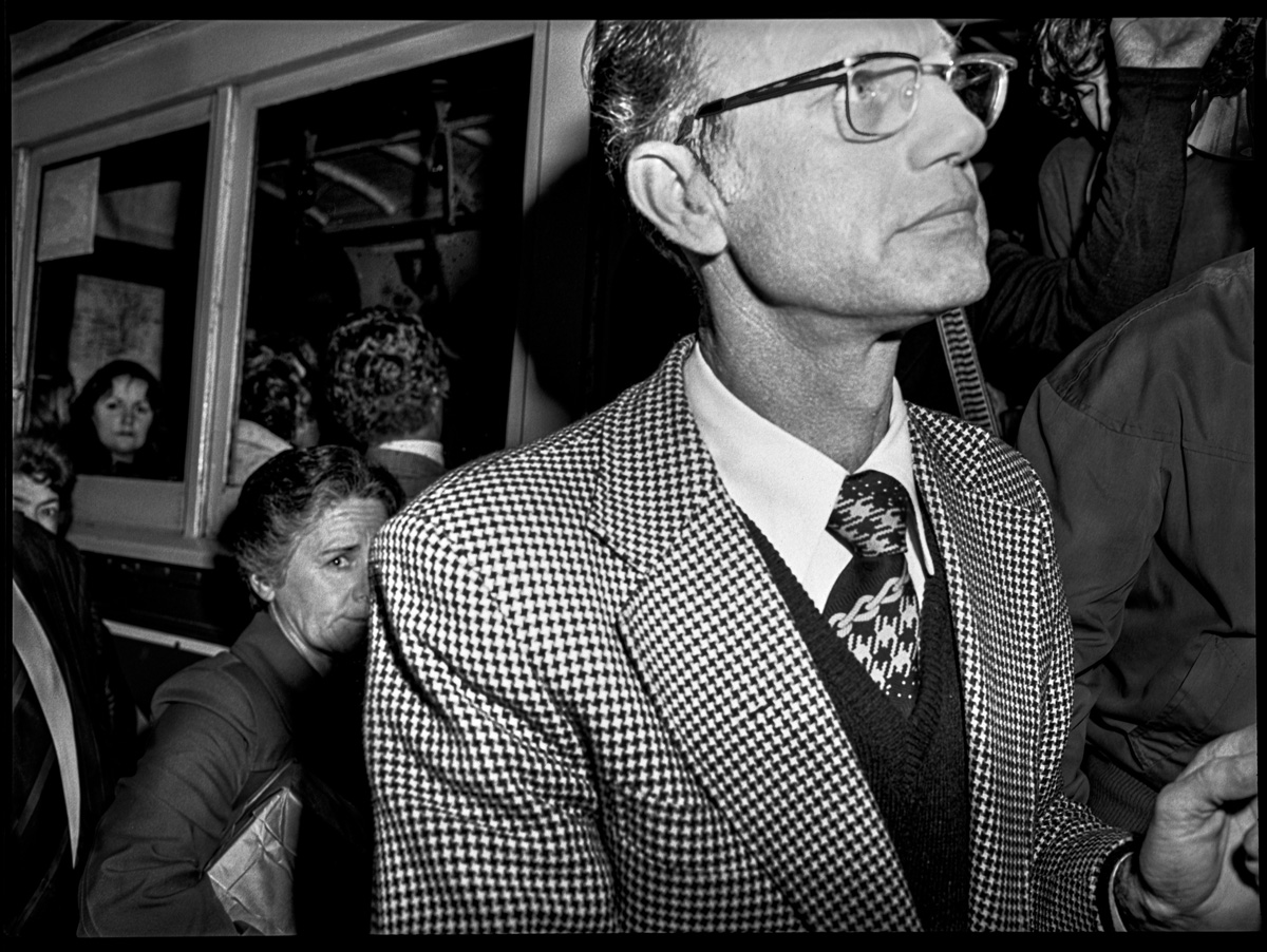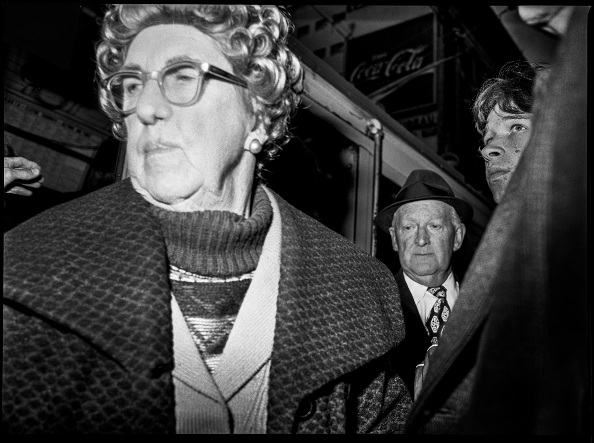 The anxious, teeth-gritting impatience of these single-minded strap-hangers is exposed in the harsh momentary blitz of Gale’s hand-held flash. Bold then, such a strategy employed now would be considered brazen, an ‘invasion of privacy.’ It is evidence of how attitudes to photographers have changed that his camera and startling flash seem to be largely ignored by these travellers.