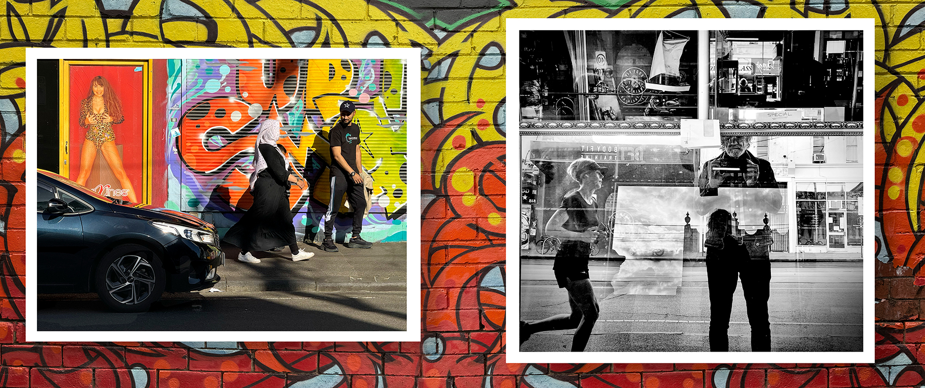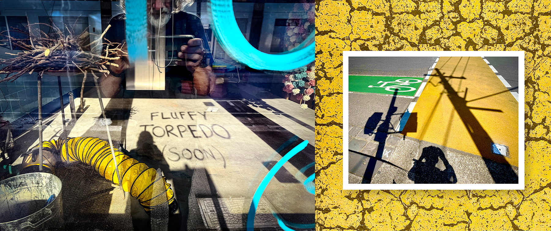 After 44 years, and now often with his mobile phone, Rob Gale still practices the street photography so popular amongst his fellow Prahran College alumni. In the process, in at least this example submitted for the 2018 Aussie Street Award judged by Jesse Marlow and shown at 541 Artspace Kent Street Sydney, he has managed to combine three of the themes from his early days as a student; transport, dogs and visual anthropology! Aptly, it is self-titled ‘LIFESTYLE’ with the symbol of a heart and under the dog “Objects in this mirror are closer than they appear”…