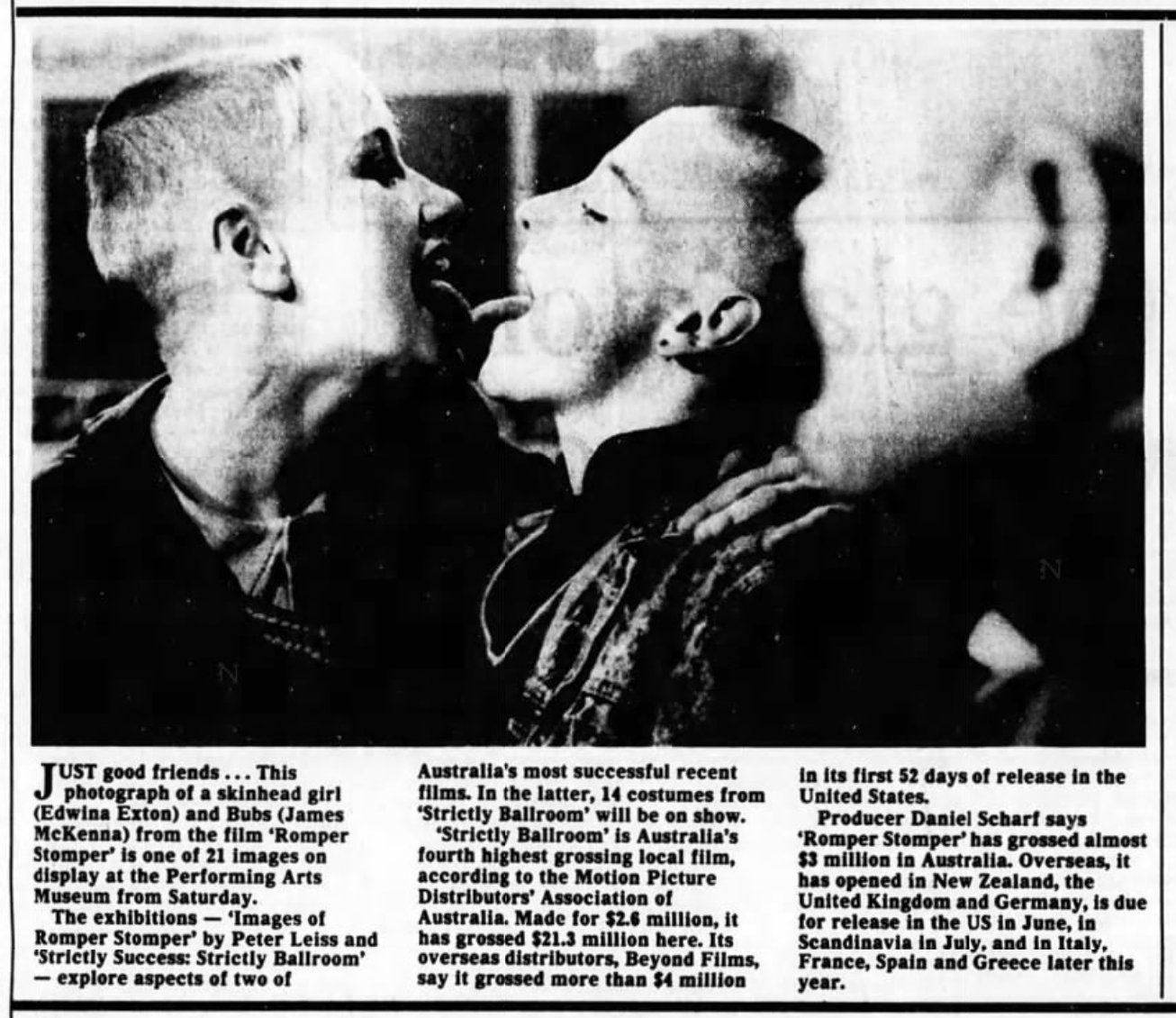 The Romper Stomper Series was exhibited at Melbourne’s Performing Arts Museum (May 1993) and elsewhere, and in 2001, the edition 3/3 of the 23 analogue prints was sold at Christies, New York.