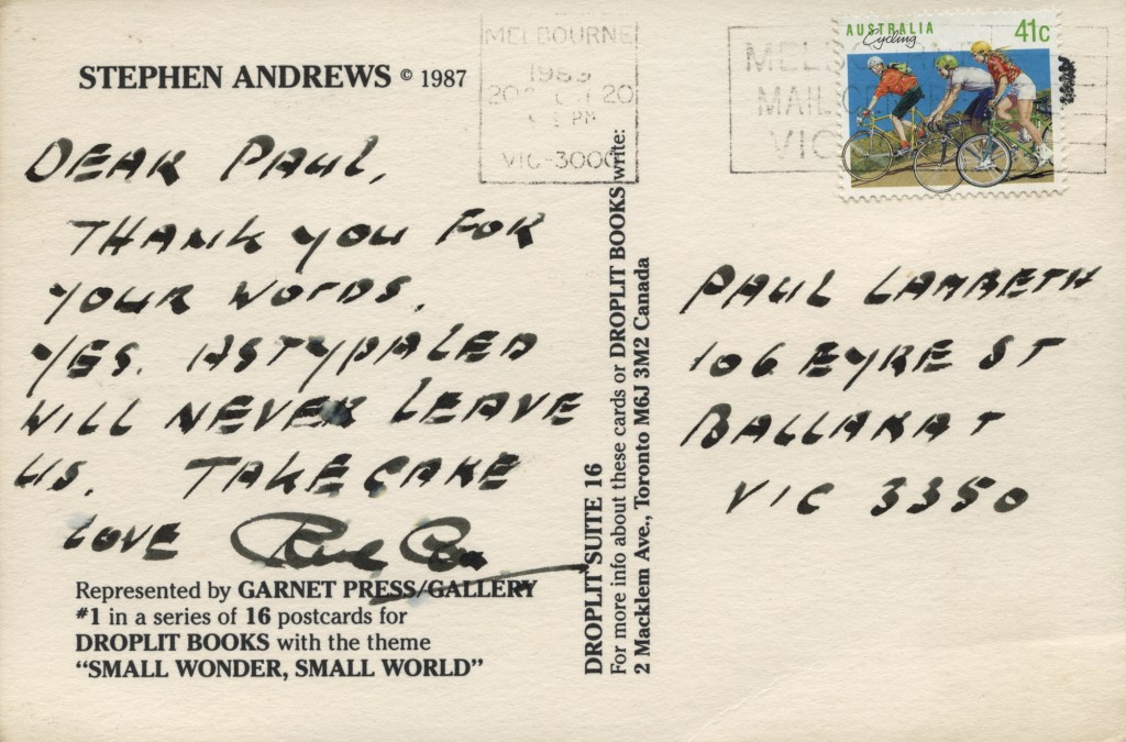 In 1975 Paul commenced studying at Prahran College of Advanced Education, describing the experience as ‘Free Range’ and somewhat raucous.
