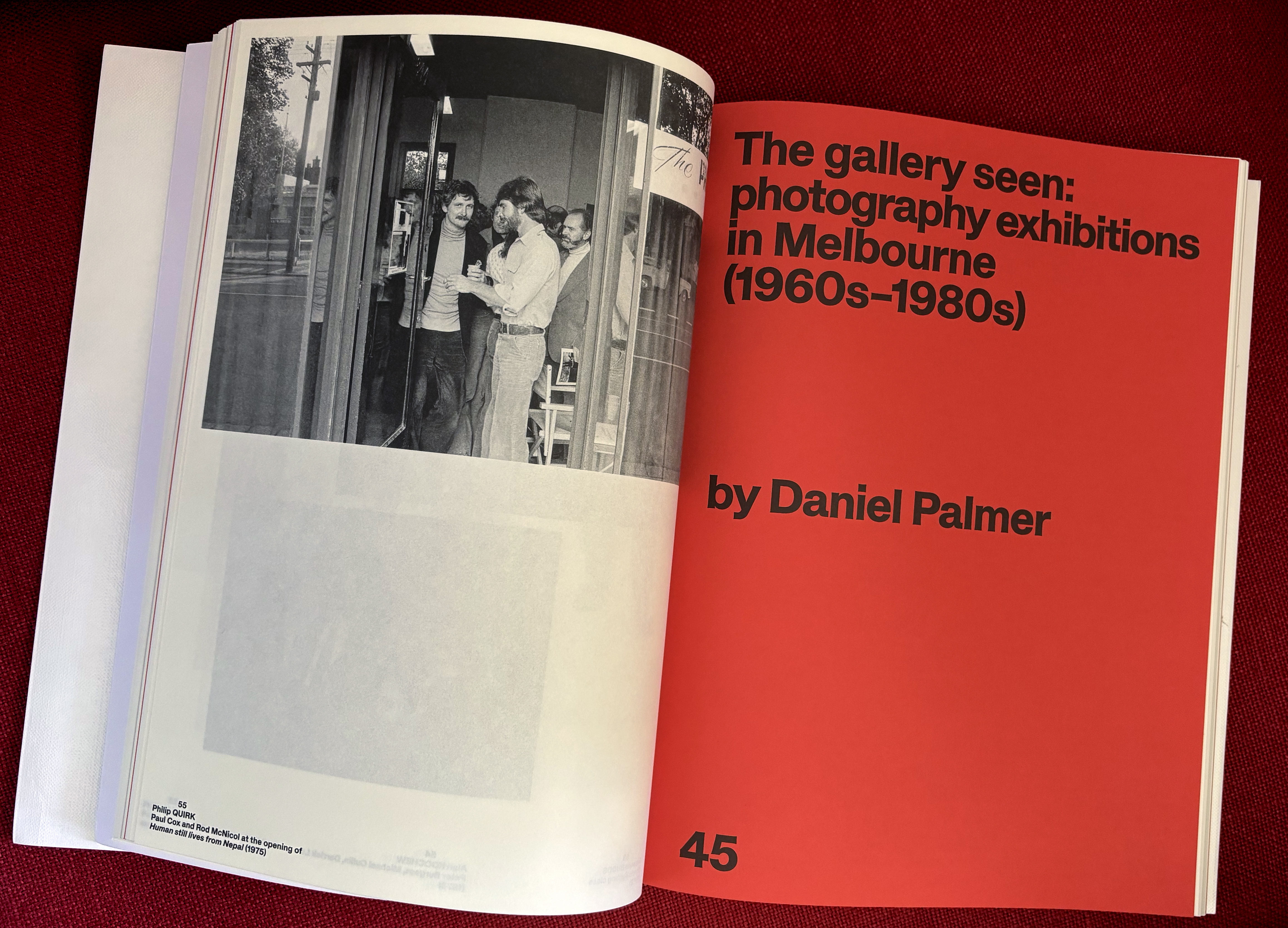 The title of Daniel Palmer’s “The Gallery Seen” is characteristic of his wry humour that so lightly carries the underlying density of his research evident in his several book publications and in this critical analysis of Prahran’s exhibition landscape that expands on his and Martyn Jolly’s encyclopaedic Installation View. He tells how these galleries helped legitimise photography as an art form while providing crucial platforms for emerging photographers. Palmer advises that when he arrived in Melbourne from Perth in 1997, Prahran’s photographic heyday had already faded in the shadow of developments in Sydney. That sets up a contrast between his retrospective view and the dynamic period that he experienced directly.