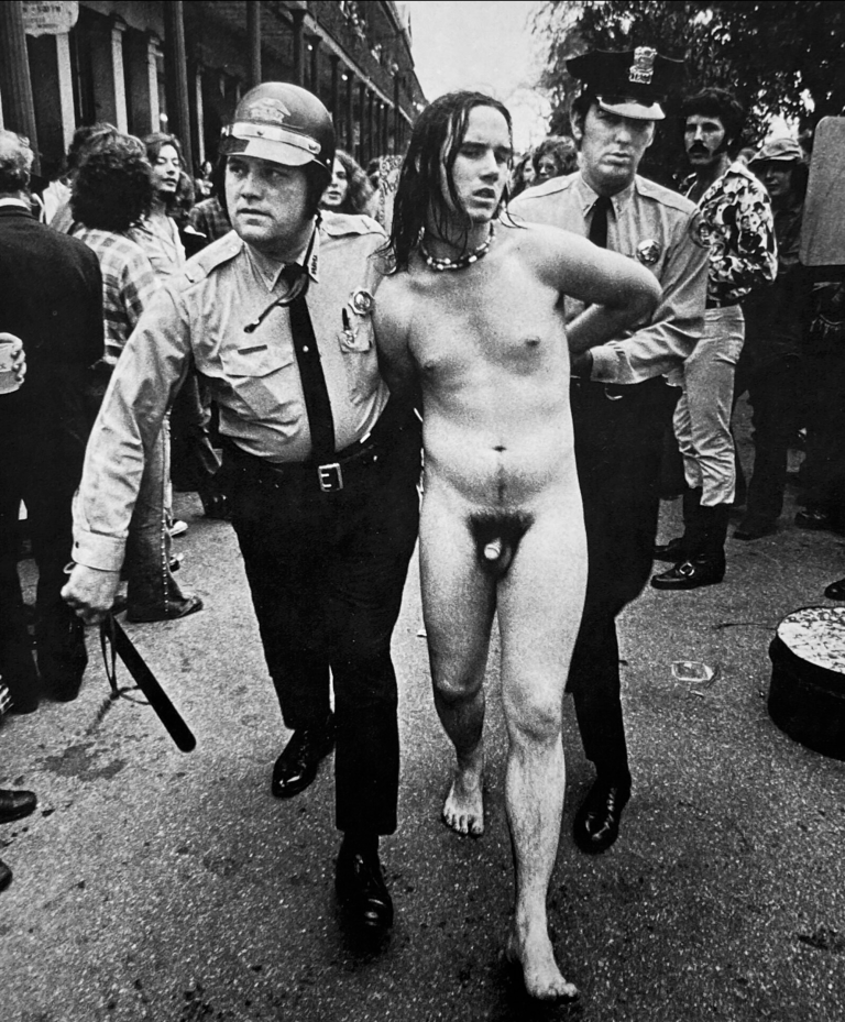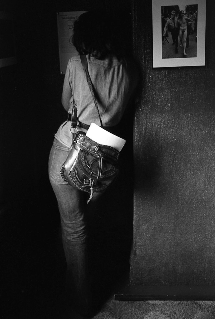 In the book, the first images encountered are portraits of Shmith and Cox by Rod McNicol, and one of Cato by Shmith, followed by pages of mostly candid or impromptu vignettes of them amongst the students and representative samples of their own work. These flow, behind the muted-olive title page for ‘A Time of Hope’, into a series of pictures by students, of students. We are pulled up at Peter Bowes’ back view of a visitor to Sidetripping at Rennie Ellis’s and Robert Ashton‘s Brummels Gallery, themselves back-to-back with the streaker in Charles Gatewood’s famous, more tightly cropped 1973 photograph. The American image in Australia’s first private gallery of photography faces the red title page of Helen Ennis’s chapter ‘Intersections: the early years’ and is a reminder of the dominance of the U.S. over us, in the 1970s.