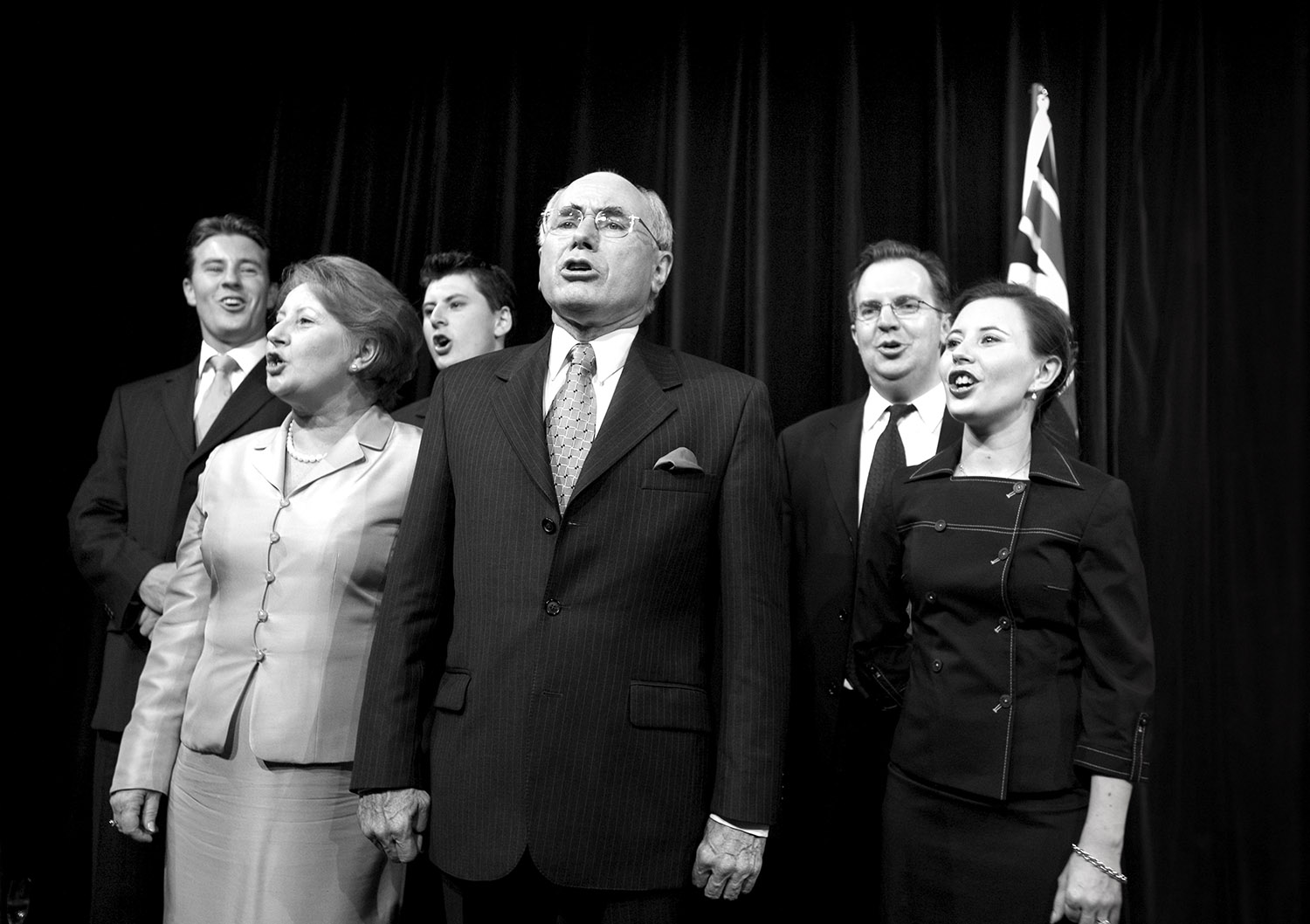 It was the evening of the 9th of October 2004 Federal Election and I was at The Wentworth Hotel Sydney awaiting John Howard’s acknowledgement of the Liberal Party’s resumption of power. Howard and his wife Janette came on stage surrounded by their family and after claiming victory went onto sing Advance Australia Fair together. This is one of the very few times in my life I absolutely knew I had landed the shot as I took it. It is an image that reads well equally as much to his supporters as to his detractors. To me it exudes the smugness of a political class. One detractor I spoke to wanted to call it ‘The Duck Family’. I’ll leave it up to the viewing audience to decide.
