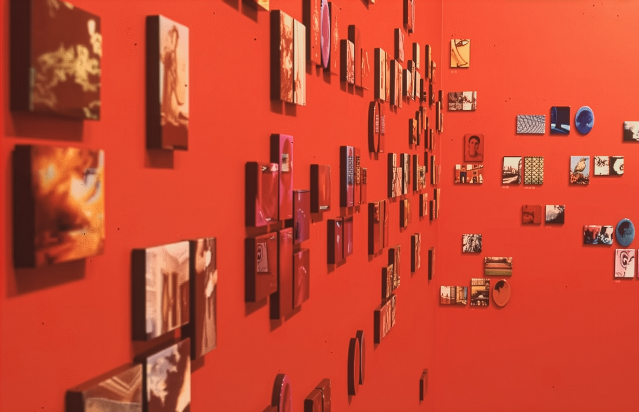 Walker’s exhibition Salon (1999) named for the densely-clustered, hierarchical displays of the 19th century academies, was immersive both in volume and colour “an extraordinary treasure trove of imagery… two hundred tiny landscapes, portraits and still–lifes hung on walls painted a deep and luxurious red. The result is daunting, rich, and intensely work-driven,” as art writer Ashley Crawford described it.
