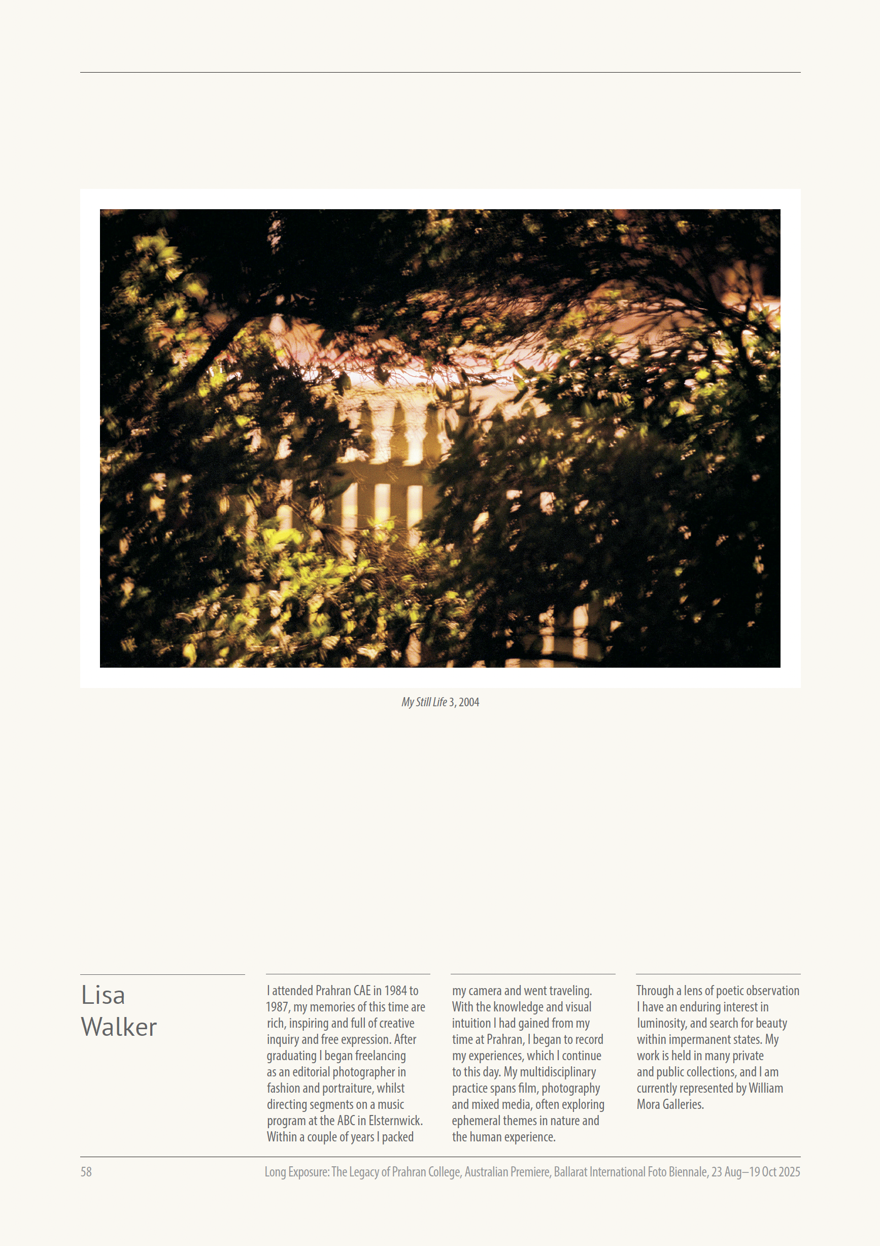 Lisa Walker (b.1967) emerged as an artist during a pivot point in Australian photography after studying at Prahran College and graduating in 1987 with a Bachelor of Fine Arts in Photography. Prahran, then renowned as the crucible of Australian photographic art, fostered a climate of experimentation. Students were encouraged to push the boundaries of the medium—drawing as much from cinema, painting, and literature as from technical craft. Reflecting on her education, Walker recalls memories that “are rich, inspiring and full of creative inquiry and free expression” and remarked to fellow alumnus Chris Beck in his 1996 Age newspaper interview with her: “I was constantly visually stimulated and fed lots of images and art.”