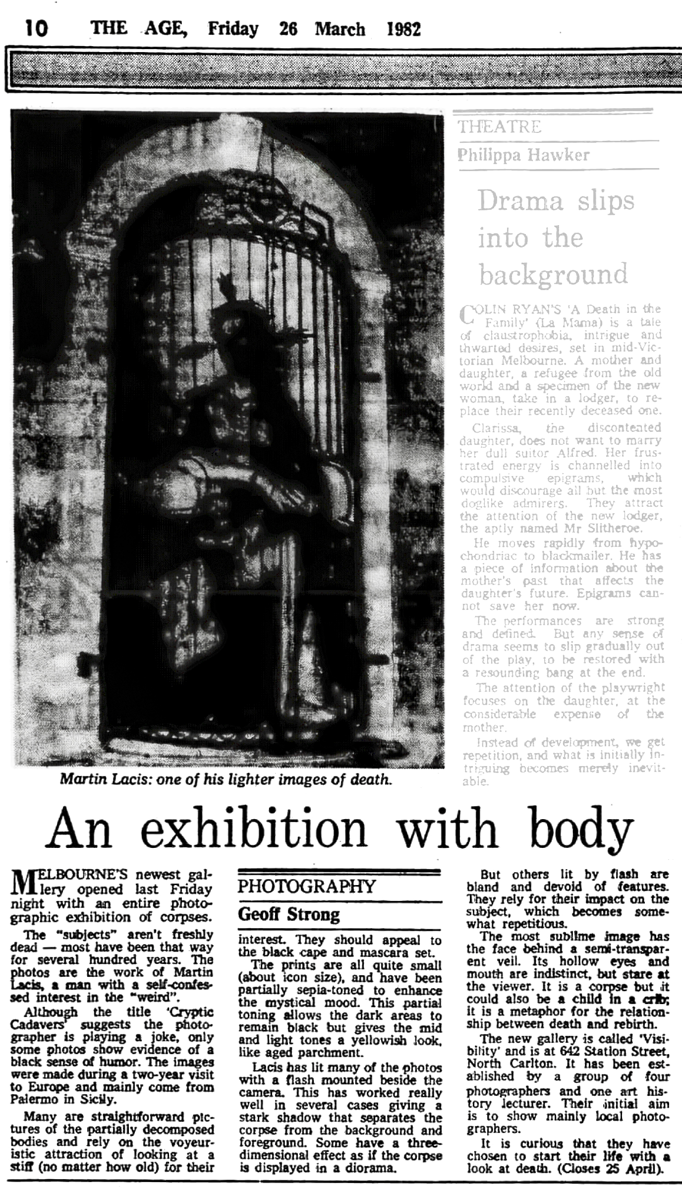 Lacis’s series was titled Cryptic Cadavers, not entirely ‘politically correct’ and rather too lighthearted to be taken as seriously as Ehrmmans’ contemplation of mortality. Lacis’ show was reviewed by another alumnus, Geoff Strong, who was then writing regular photography reviews for The Age. In a characteristically devilish remark Strong quipped that: “It is curious that [Visibility] have chosen to start their life with look at death.”