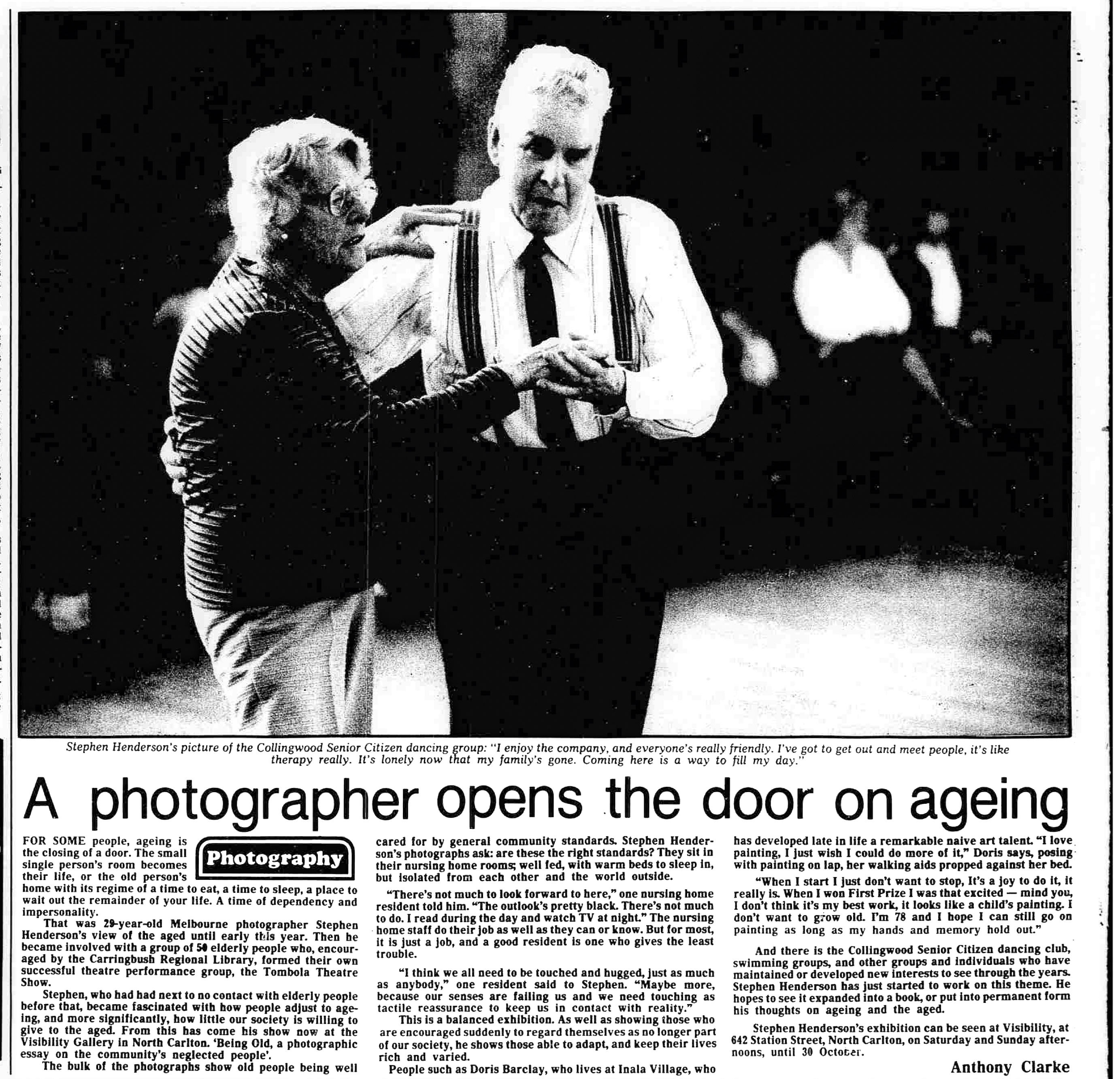 Industrial Woman later toured, and a book version was issued in 1986 (see; Johanna Drucker’s A Century of Artists’ Books pps. 289-90, 289, 291, 296). A similar commitment to socio-politcal issues is evident in other shows at Visibility. Stephen Henderson exhibited Being Old, a photographic essay on the community’s neglected people over October 1983.