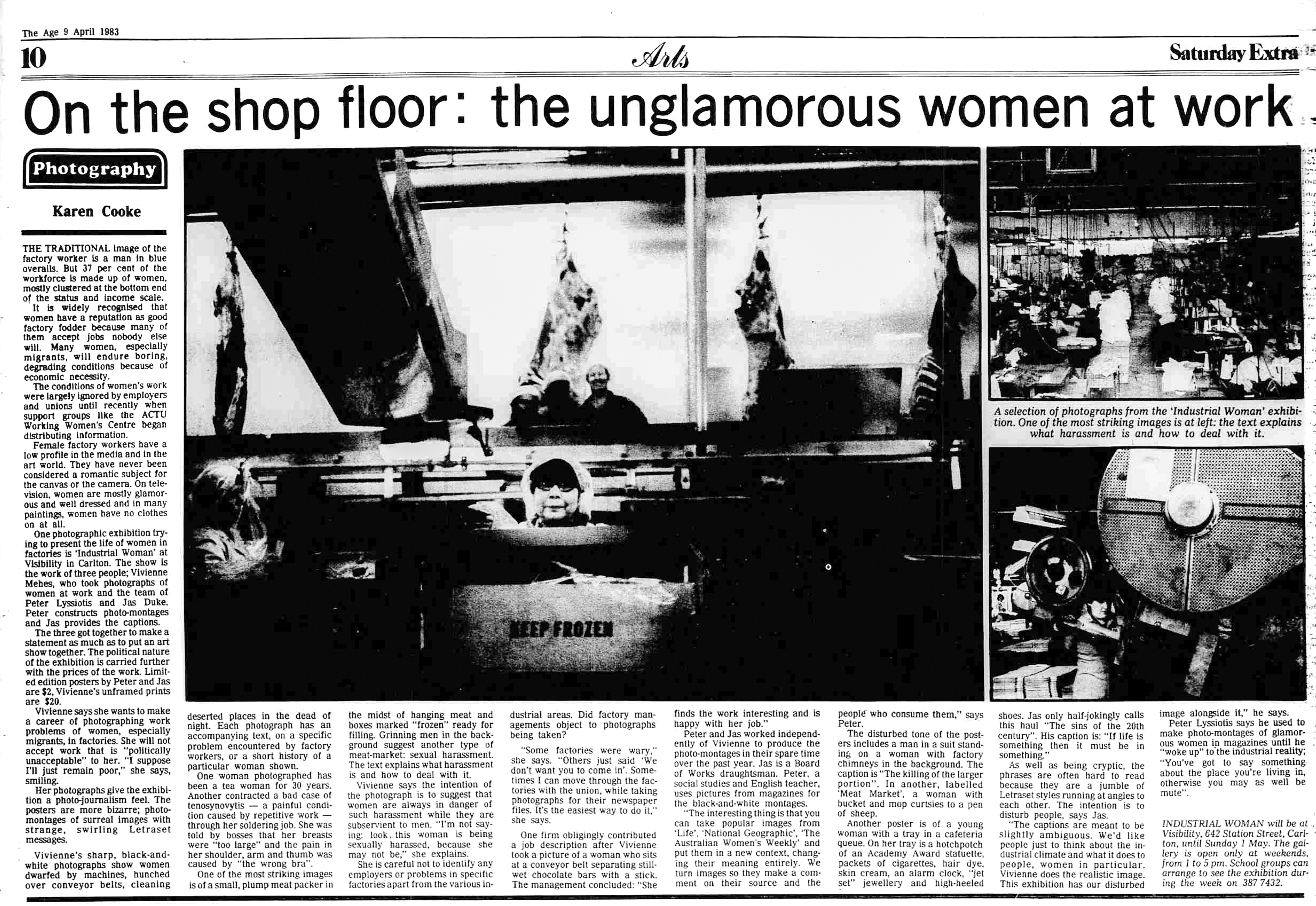 low profile in the media and in the art world. They have never been considered a romantic subject for the canvas or the camera,” and commends Industrial Woman, acknowledging the collective effort of the exhibitors Mehes, Lyssiotis and Duke “to make a statement,” its political nature being reflected in the prices—limited edition posters by Peter and Jas at $2, and $20 for Vivienne’s unframed prints. Cooke quotes Mehes: