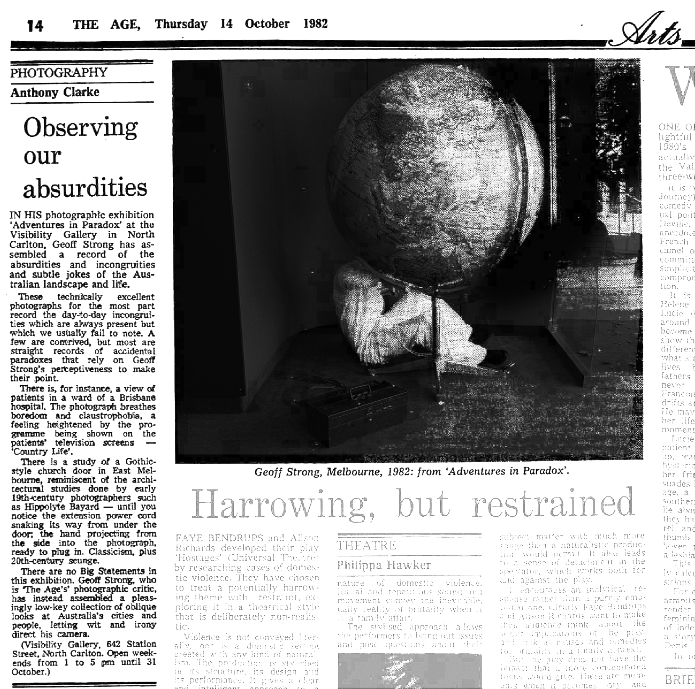 Strong himself, for his Adventures in Paradox at Visibility in October 1982 was reviewed by fellow Age critic Anthony Clarke: