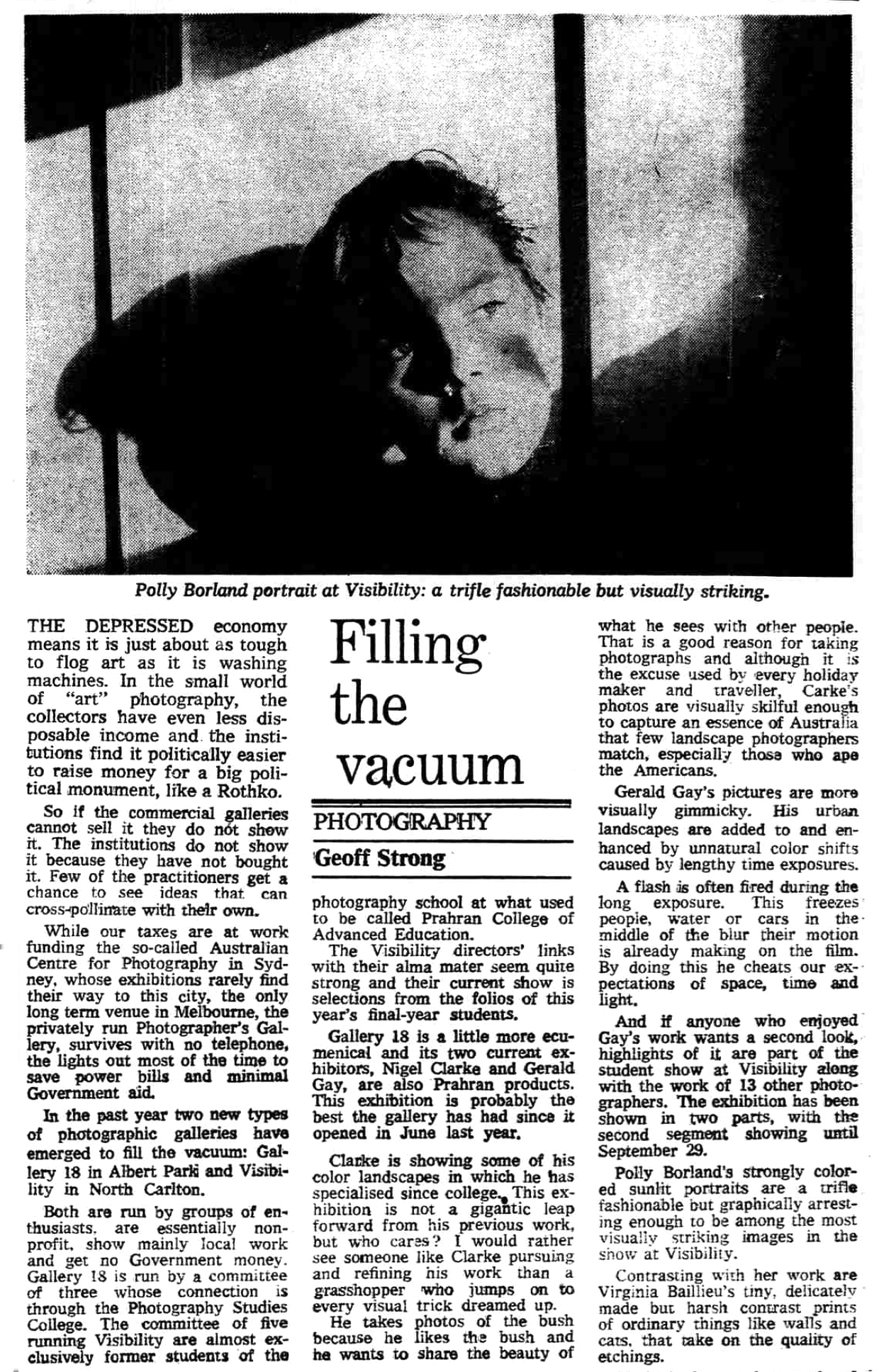 Daniel Palmer notes of Visibility, in his essay ‘The gallery seen: Photography exhibitions in Melbourne 1960s–1980s’ in The Basement: Photography from Prahran College 1968–1982, that the gallery “started to engage with the political potential of critical photographic thinking,” in agreement with Anne-Marie Willis‘s assessment (Willis, Picturing Australia, p 247) of its ‘community photography projects’ and shows ‘with a socio-political flavour.’